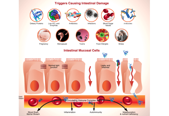 He explains that some toxins are released by certain bacteria and that porous intestines and blood-brain (hemato-encephalic) barrier allow them to pass on through to the brain.